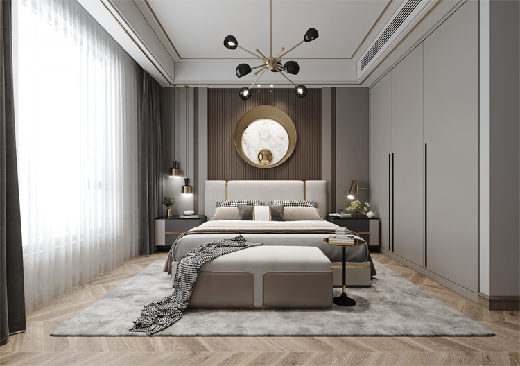 對稱式床頭設(shè)計給人以沉穩(wěn)典雅氣息,放射式燈飾既吊頂處的金色鑲邊處理則平添高級格調(diào)。