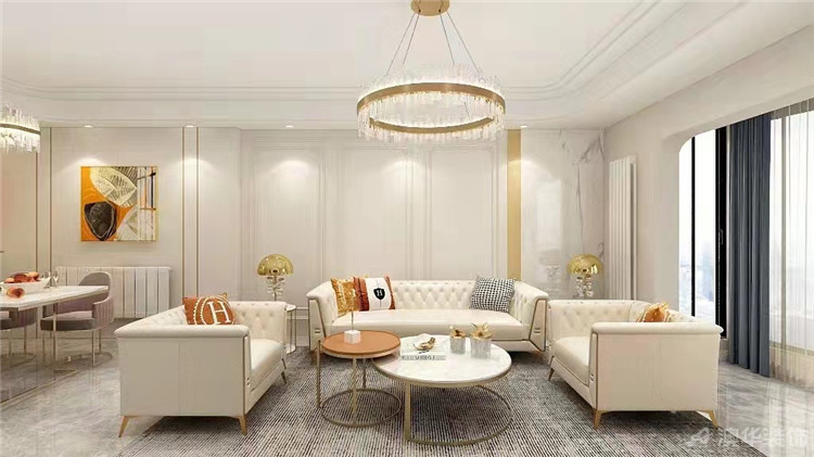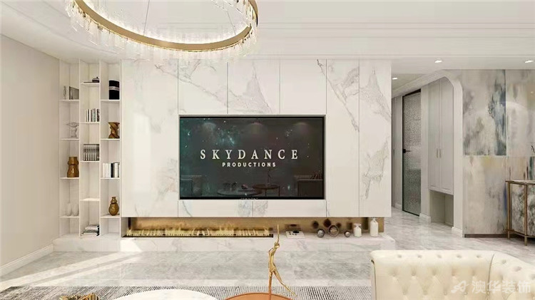 客廳與餐廳相互結(jié)合,功能區(qū)之間并沒有明顯隔斷,設(shè)計師通過燈具和背景墻的造型來進行分區(qū),讓整個空間變得更加和諧舒適;電視墻使用了大理石鋪貼,并在左側(cè)增設(shè)了收納柜,讓客廳空間變得更加富有時尚感和層次感。