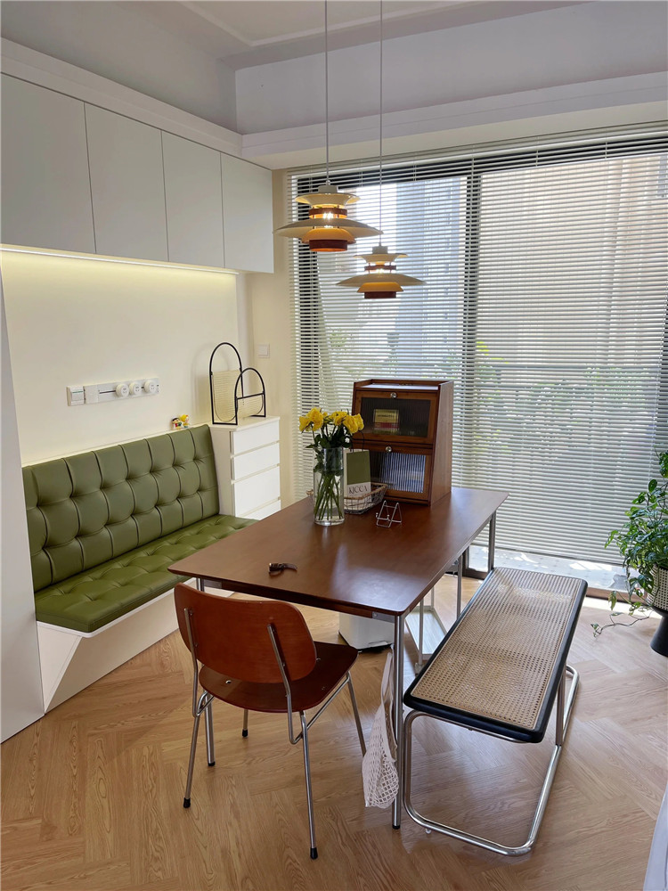 對(duì)于這種情況,完全可以將餐邊柜與卡座結(jié)合,實(shí)用不占空間。常見(jiàn)的卡座設(shè)計(jì),會(huì)把卡座內(nèi)部留空,當(dāng)做儲(chǔ)物柜使用。