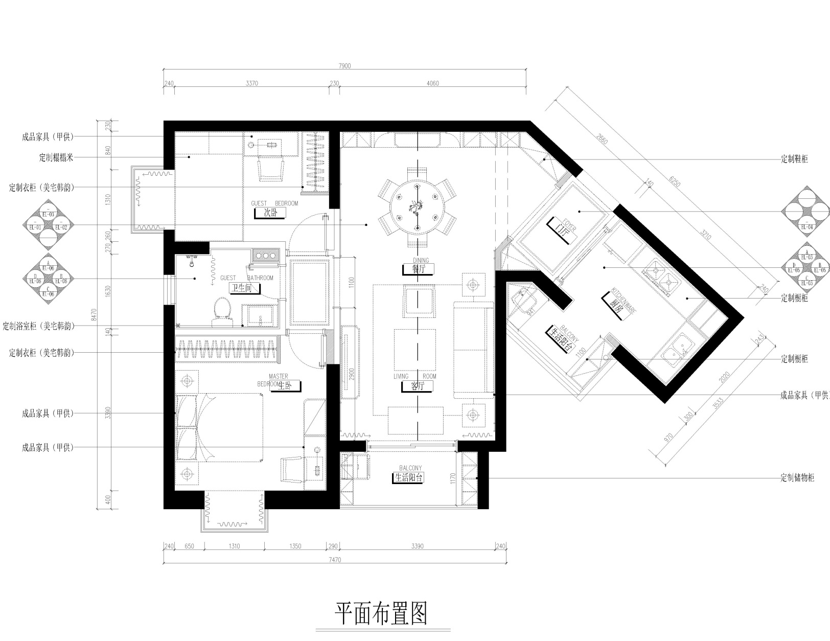 世紀江尚這套89㎡的房屋戶型存在著較大缺陷,原本房屋建筑面積就不算大,還存在著一個突兀的拐角空間,因此在設計時需要對空間的功能區(qū)域進行合理的劃分,同時對拐角區(qū)域的空間進行合理的利用,以避免空間出現(xiàn)違和感。而由于房屋整體面積較小,因此家具的選擇上則多考慮小體量家具,避免造成視覺違和感。