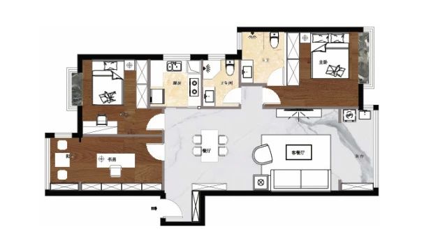 2 三臥室+一書房設(shè)置,滿足多人口家庭需求。