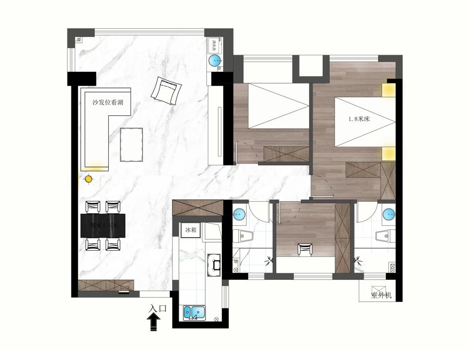 2 主衛(wèi)納入主臥,形成一個便捷舒適的套間。