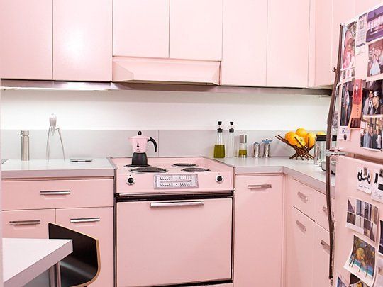 不僅僅是櫥柜,就連油煙機(jī)、冰箱等全都是粉色系,誓將粉色進(jìn)行到底。為緩解粉色的飄忽感,在臺(tái)面選擇灰色及不銹鋼來(lái)勾勒造型,值得學(xué)習(xí)的小技巧哦~