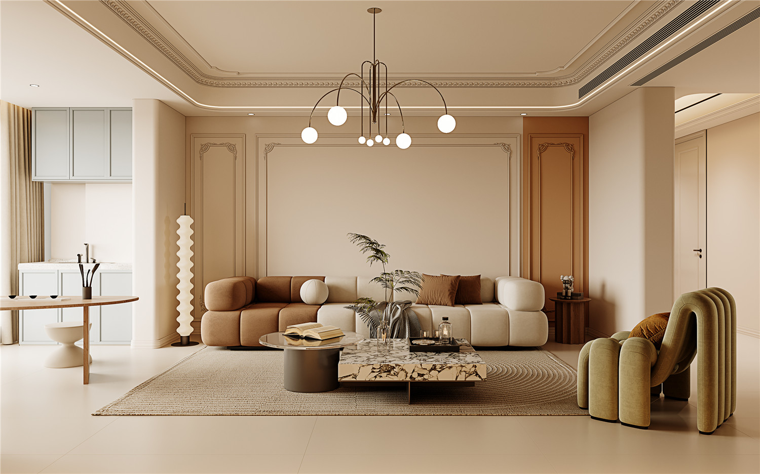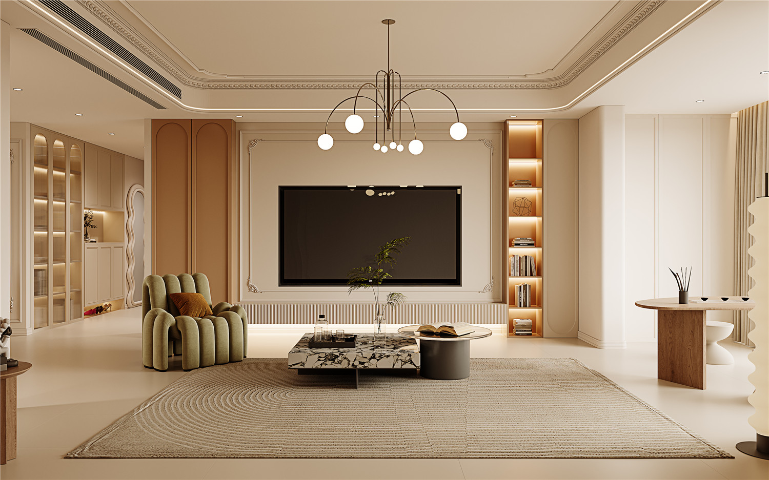 淡雅的奶油色在空間中悠然彌漫,輕柔地調(diào)和客廳的氛圍,使之更顯柔和與恬靜。墻面則巧妙地運用拼色設計,結合經(jīng)典的法式雕花與流暢線條,勾勒出豐富而獨具匠心的紋理與層次,為整個空間增添了一抹優(yōu)雅與精致的氣息。