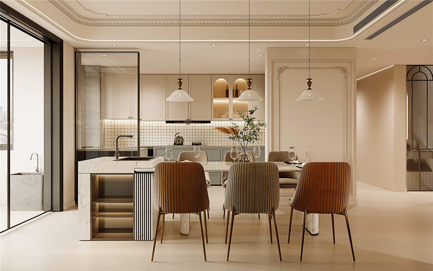 島臺旁,一列高挑的法式櫥柜展現(xiàn)著非凡的氣度,定制設計將恒溫酒柜、管線機完美嵌入,同時保留了充裕的收納空間,讓廚房用具井然有序。背景墻上,湖藍色瓷磚如同法式莊園中的靜謐湖泊,將用餐氛圍渲染得更為寧靜與優(yōu)雅。