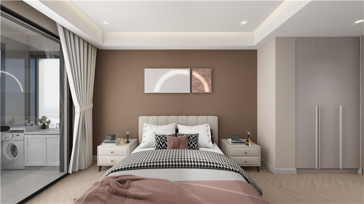 大面積落地窗有效提升臥室采光,藕粉色背景墻營造溫馨靜謐感,搭配上色彩裝飾,簡約而又時(shí)尚。
